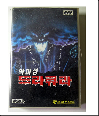 Portada Coreana del Vampire KillerAh se me olvidaba os dejo con un enlace donde en ella hay un par de fotos de ediciones MSX que tal vez sean M.I.A. o sea, que aun no están catalogadas, pero al estar de canto y en Coreano no he podido conocer que juegos son, la mayoría de ellos tiene la marca Zemmix, pero vete a saber, total os dejo el enlace a ver si tenéis suerte y conocéis alguno, que por cierto os animo a comentarlo luego.